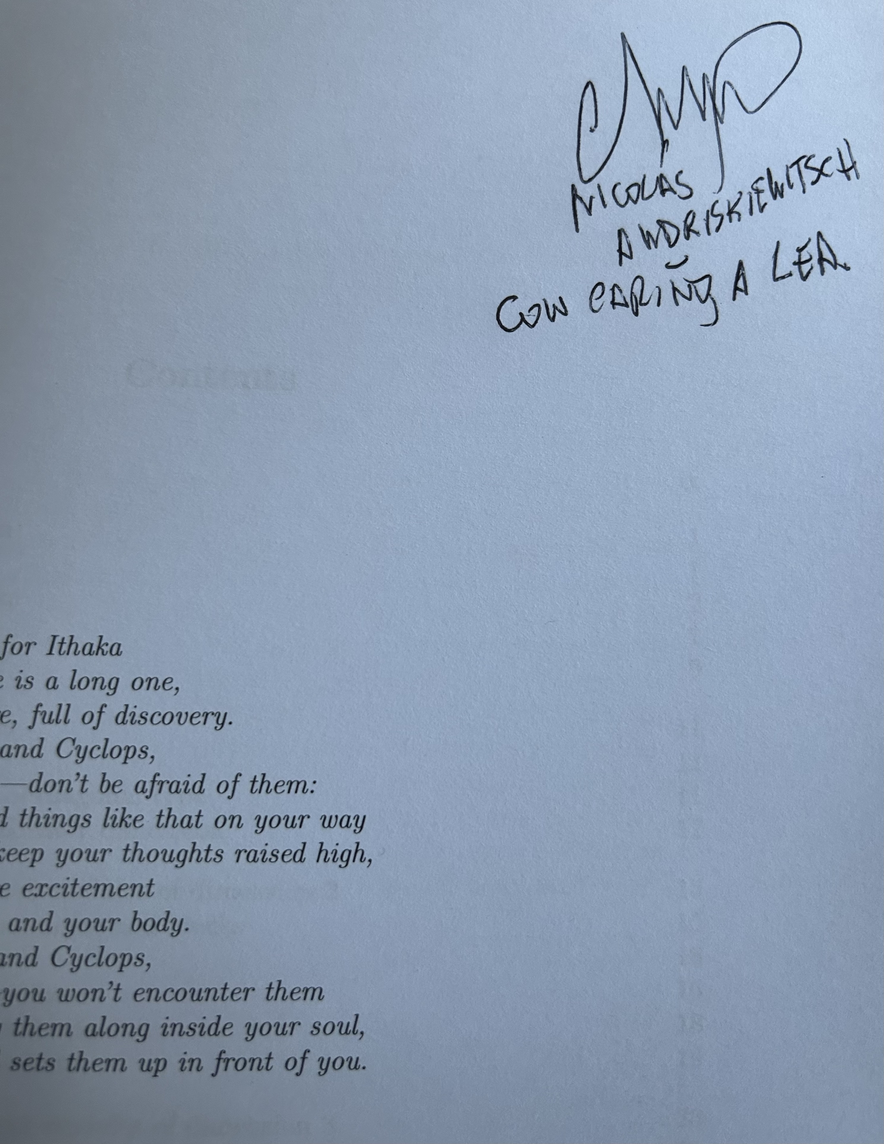 More than once, friends and colleagues have taken my books to conferences to collect signatures on my behalf. For this, I extend my thanks to Ilaria Colazzo, Carsten Dietzel, Davide Ferri, Marino Gran, Geoffrey Janssens, Kevin Piterman, Arne Van Antwerpen, and, of course, to everyone who kindly agreed to sign my books!